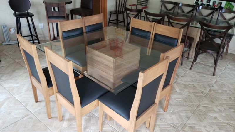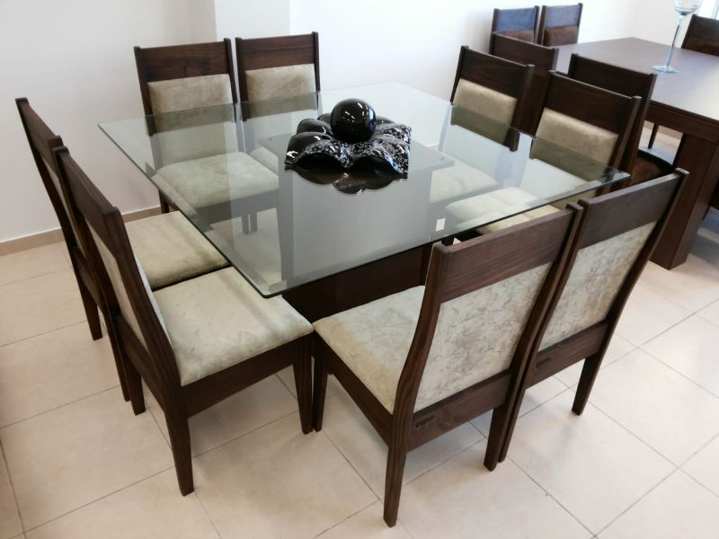MESA VENETO 150X150CM EM VIDRO 10MM BISOTE COM 8 CADEIRAS C03 ESTOFADAS EM MADEIRA MACIÇA.